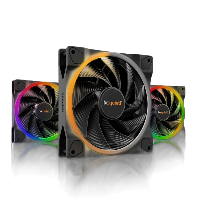 140mm front and top, 120mm rear or bottom as the chassis dictates. Six-pole fluid-dynamic bearing for low audible signature without the wear pattern of a rifle bearing. Static-pressure-optimized blade geometry sustains airflow against radiator and dust-filter restriction.